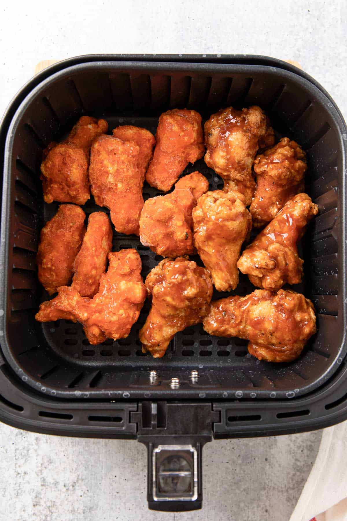 If you want to sauce your wings, pour an even amount of sauce over the wings as soon as they come out of the air fryer. Then place them back in the basket and air fry 2 or 3 minutes more. Evenly coat in sauce again.