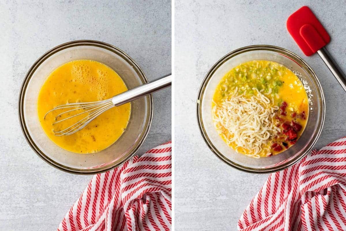 - In a large bowl, whisk eggs. Add chopped roasted bell pepper, chopped green onions, crumbled feta, shredded mozzarella cheese, water, and salt and pepper.