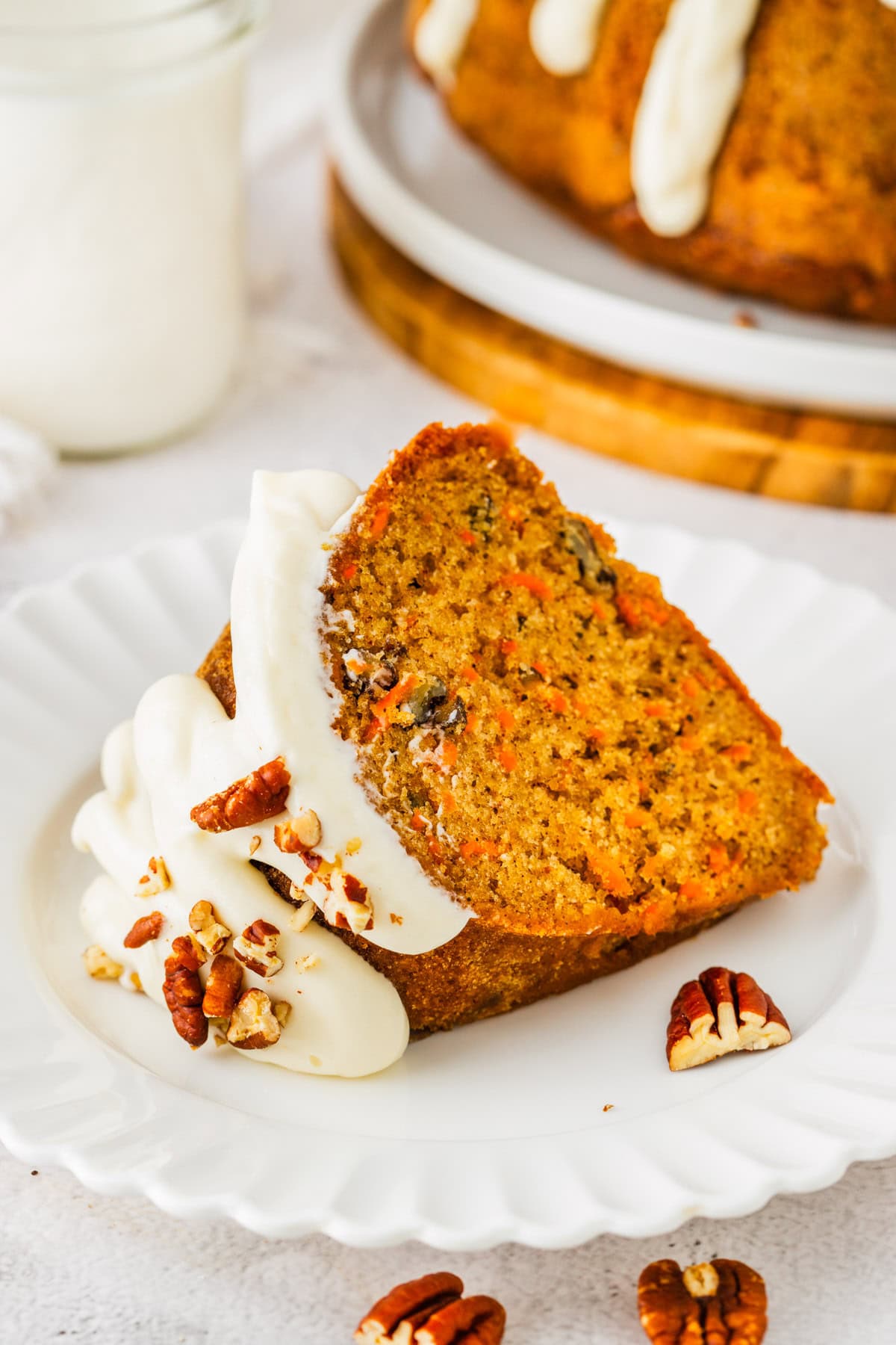 9. Drizzle or pipe the glaze over the cooled cake, letting it drip down the sides. Sprinkle immediately with finely chopped toasted pecans before the glaze sets. Slice and enjoy your delicious carrot bundt cake!