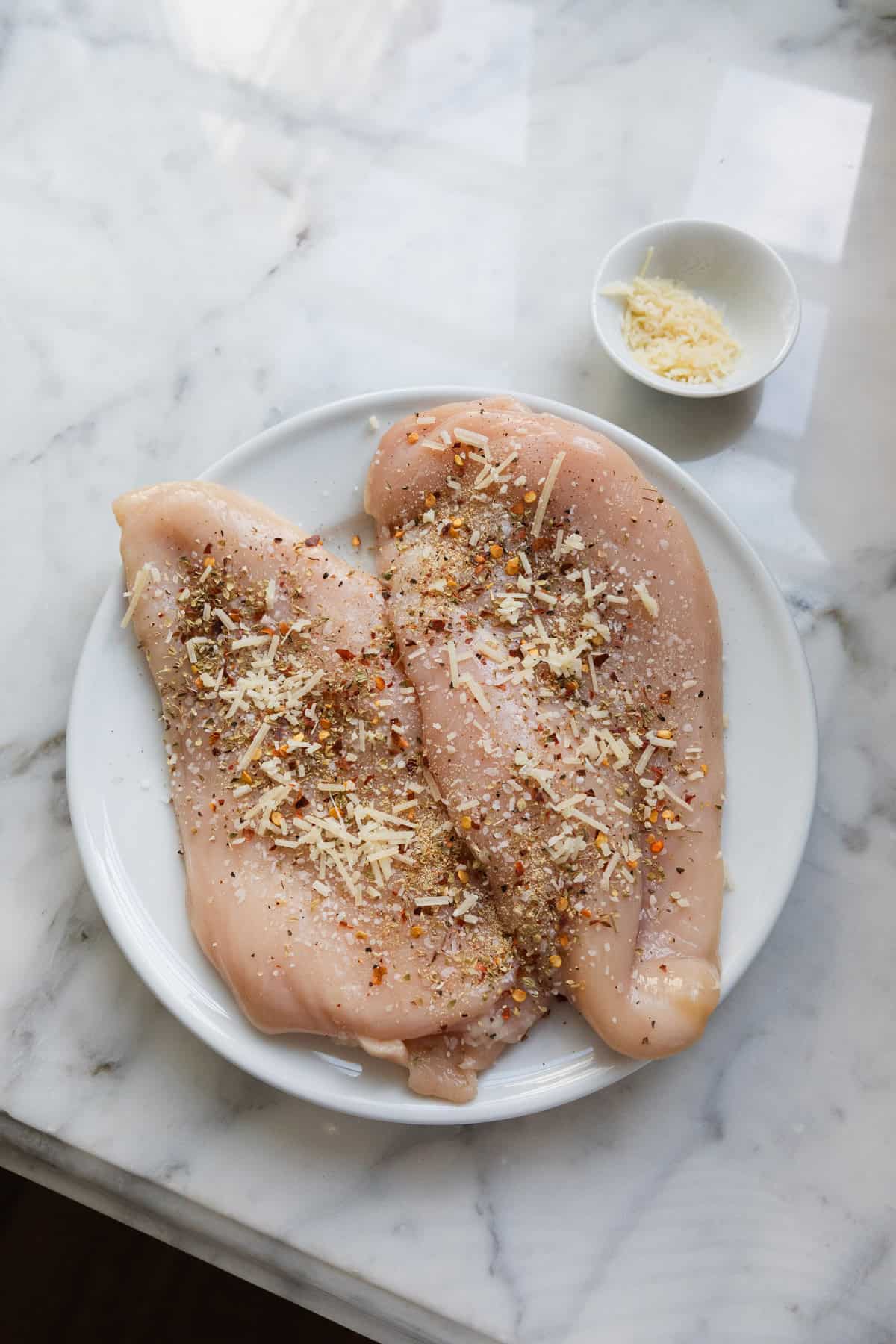 - If the chicken breasts are thick, pound them to an even size. I put mine in a ziplock bag and used a rolling pin. Then, mix oregano, garlic powder, onion powder, and crushed red pepper to create a spice mixture. Season one side of the chicken with salt, pepper, half the spice mix, and one tablespoon Parmesan cheese. Press cheese and seasoning onto the chicken.