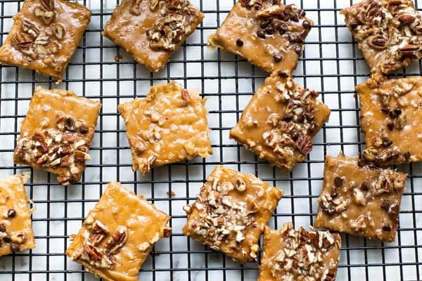 6) Let the graham cracker pralines cool on the cookie sheet for 10 minutes. Cut or break them into your desire shape and let cool completely on wire racks. I like to store mine in the refrigerator, but you can leave them out at room temperature in a tightly fitting container as well.