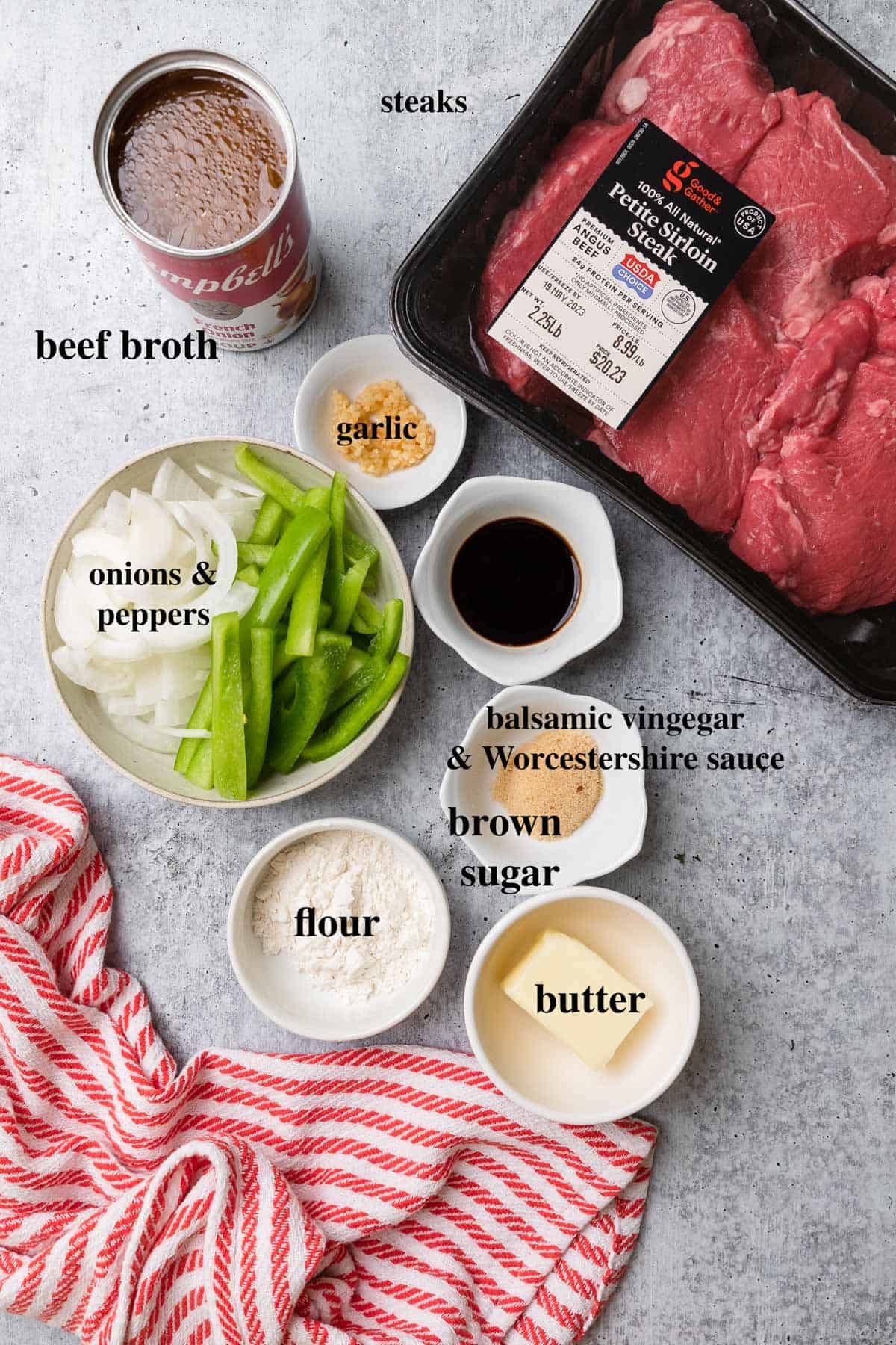 - Remove the steaks to a plate and set aside. To the same pan, add a tablespoon of butter if needed. Add sliced peppers and sliced onions, and garlic and saute until slightly softened, about 2 minutes. Move them over to the same plate with the steaks.