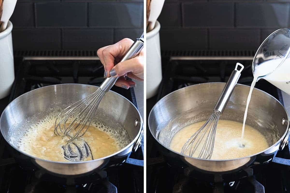 - Melt 4 tablespoons of butter in a medium saucepan over medium heat. Add flour and cook for one minute whisking constantly. Slowly add milk in a thin stream, continuing to whisk.