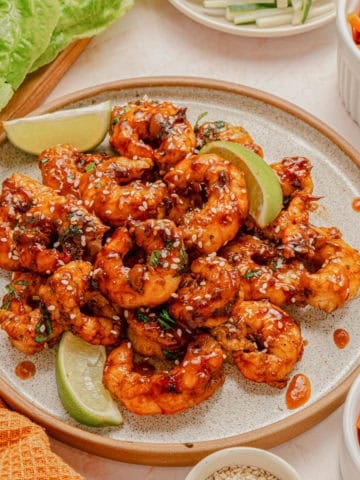 • Sweet and spicy shrimp with lime wedges on a plate.