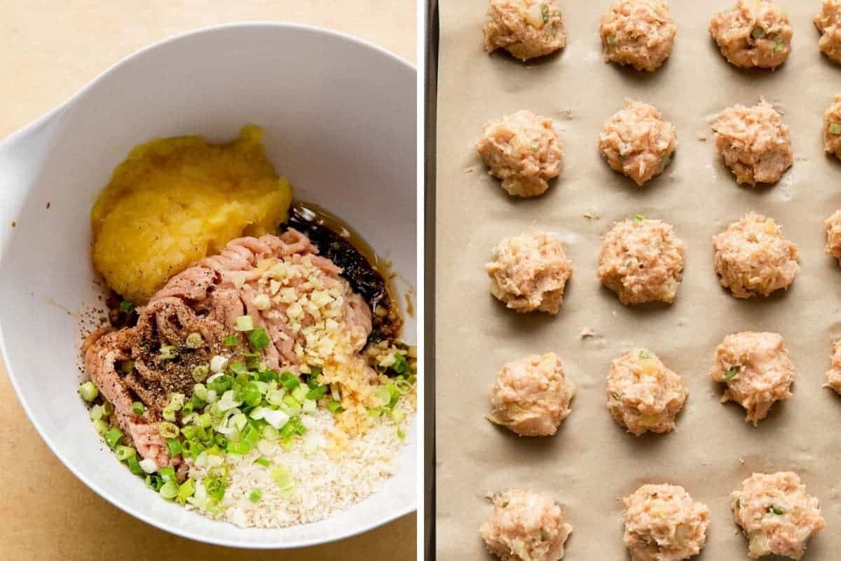 Note that the ground chicken meatball mixture will be very soft and somewhat sticky.