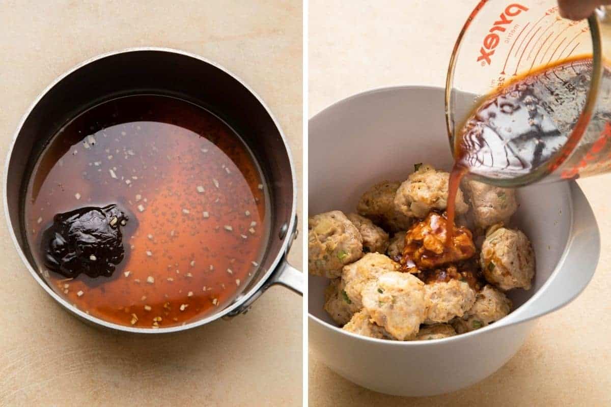 - While meatballs cook, combine all teriyaki sauce ingredients in a saucepan over medium heat. Whisk until the sugar dissolves then let the sauce simmer on the lowest heat possible, until slightly thickened, about 8 minutes. Remove from heat and set aside until meatballs are finished.