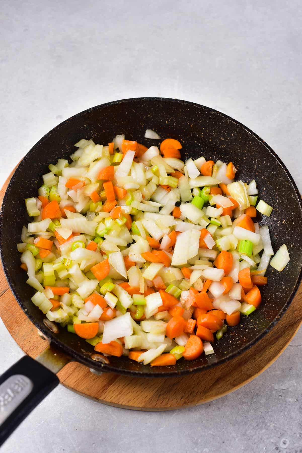 - Turn heat to medium. Add more oil to the pan to scrape up the browned bits from the bottom of the pot. Now, add the chopped onions, carrots and celery. Cook for 5 minutes stirring occasionally, being sure the veggies don't burn.